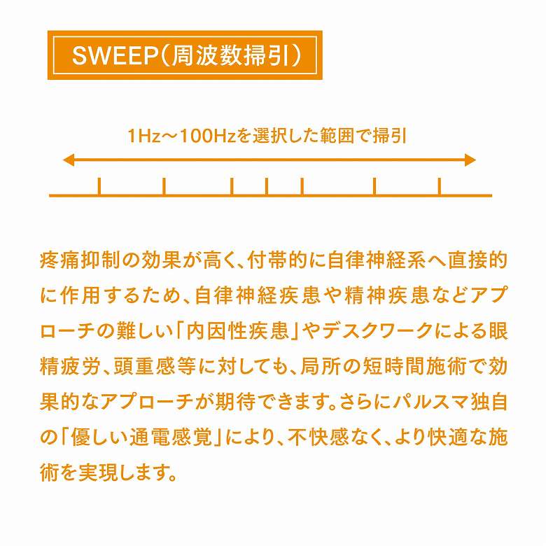 疼痛抑制の効果が高く、付帯的に自律神経系へ直接的に作用するため、自律神経疾患や精神疾患などアプローチの難しい「内因性疾患」やデスクワークによる眼精疲労、頭重感等に対しても、局所の短時間施術で効果的なアプローチが期待できます。さらにパルスマ独自の「優しい通電感覚」により、不快感なく、より快適な施術を実現します。