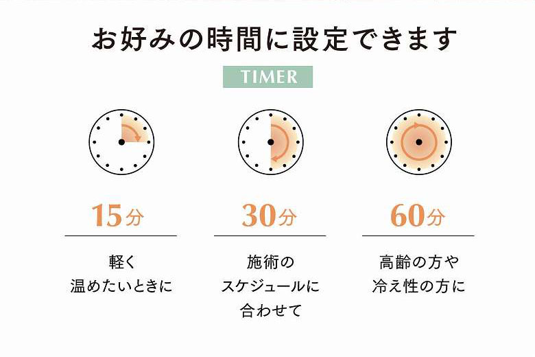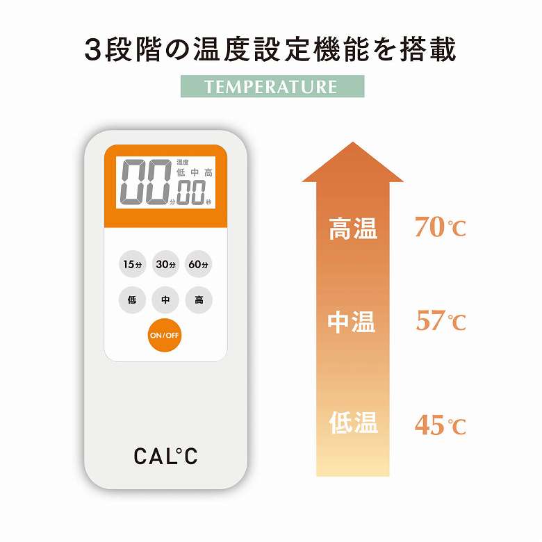 腕や脚にしっかり巻きつけられるMサイズ。 膝掛けとしてもお使いいただけます。 セルフケアにもおすすめのサイズ感です。 治療家の方のお声に応え、CAL℃は最高温度を70℃までUP。 施術の幅が一層広がります。 また、最高温度の到達時間は13分と早いため、電源を入れてすぐ温熱が始まります。 低・中・高、3段階から選べる温度設定機能で、体温や身体の冷え方に合わせ調節可能です。
